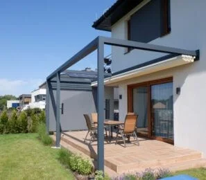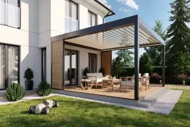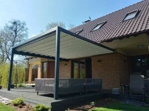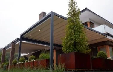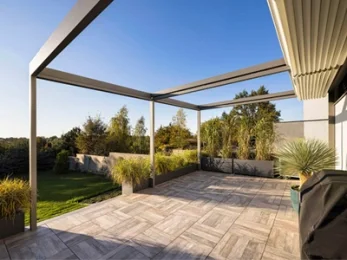 Die elegante Überdachung mit einem drehbaren Dach, das vor wechselnden Wetterbedingungen schützt. Die gut konstruierten Lamellen wirken hitzeabweisend, schützen vor Niederschlägen und tragen Schneelasten.